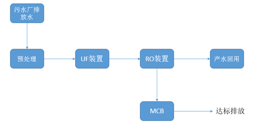 本工藝采用易膜自主研發(fā)的壓力式PVDF中空纖維超濾膜和低能耗反滲透膜,雙膜工藝結(jié)合MCB工藝,應(yīng)用于污水處理廠排放污水的再生回用。經(jīng)過處理后的污水可達(dá)工業(yè)自來水的指標(biāo),膜濃水達(dá)到一級(jí)A的排放標(biāo)準(zhǔn)。